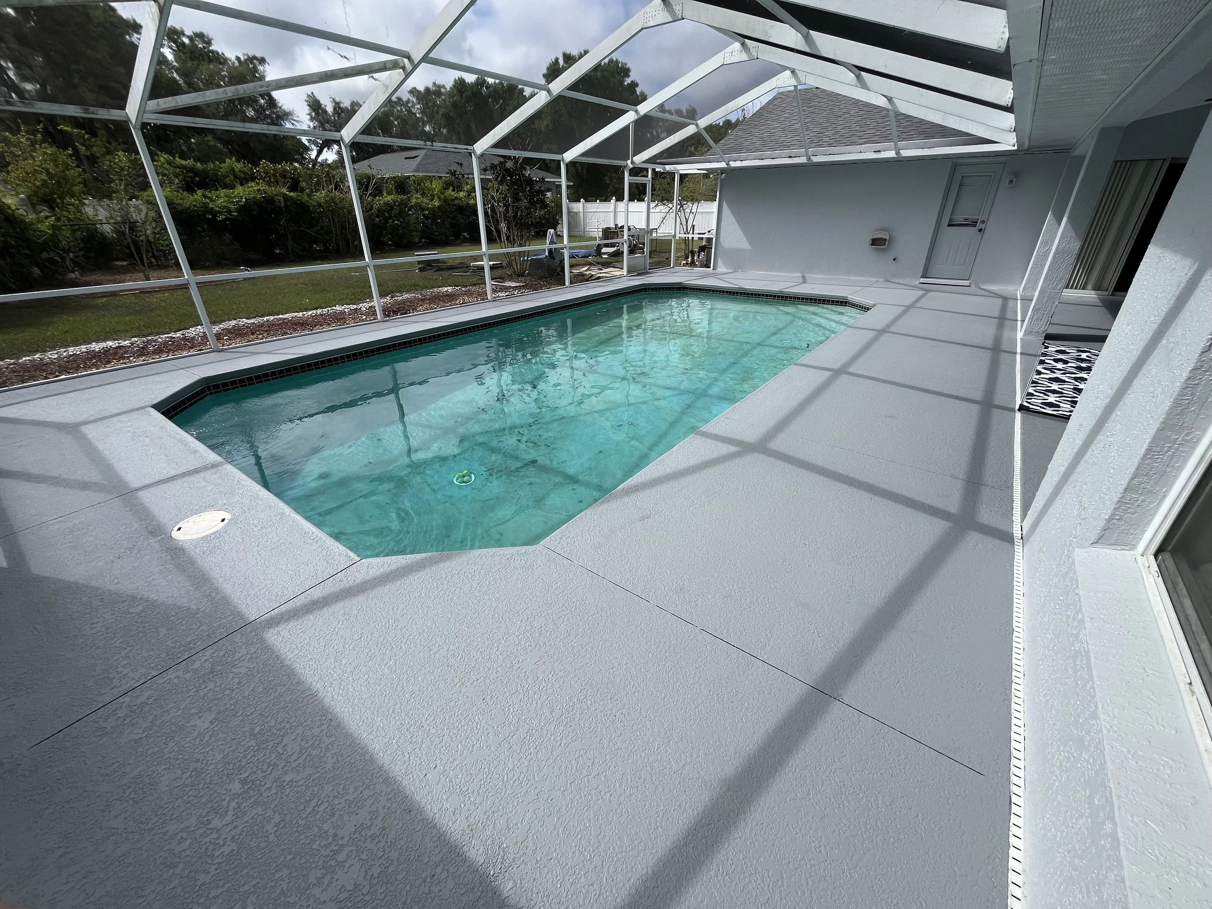 An enclosed backyard swimming pool with white textured concrete deck, surrounded by a screened structure, adjacent to a white house with sliding glass doors, and lush greenery outside.